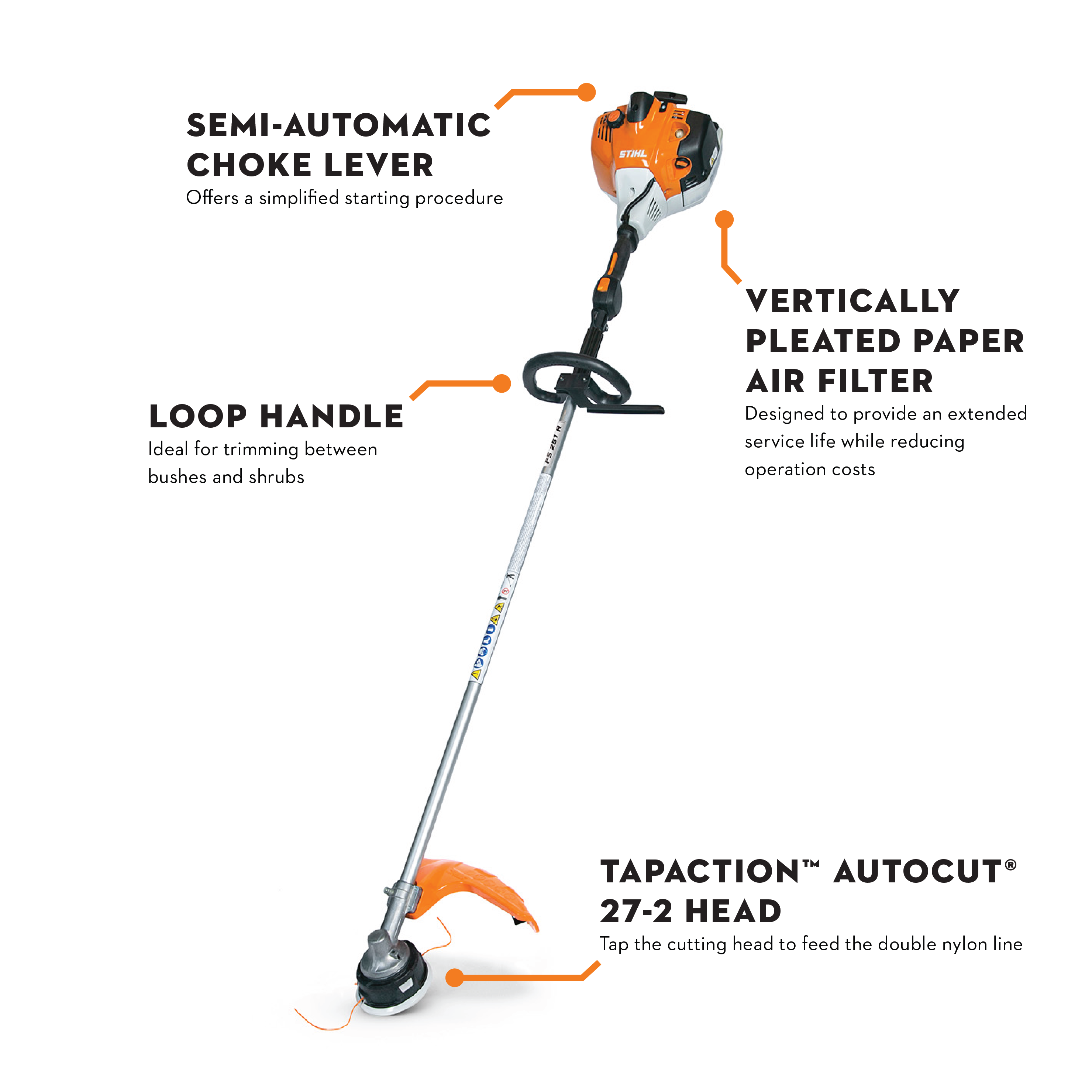 Equipped with a simplified starting procedure, the FS 251 R was built for pros with no time to waste. Designed with a powerful low exhaust emission engine, the FS 251 R saves users on fuel and operating costs without losing any of the power that they count on to get the job done. The FS 251 R combines its rugged design with versatile features such as the loop handle, ideal for trimming between bushes and shrubs and other hard to reach areas, to provide users with a heavy-duty tool that provides optimal maneuverability to handle a variety of situations. Equipped with a vertically-pleated paper air filter that provides an extended service life, users can get to work quicker and count on this gas trimmer to last longer. Note: Not available for purchase or delivery in California