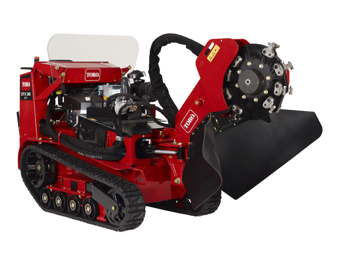 Toro® STX-38 Stump Grinder is built for outstanding durability in the toughest conditions. Fully hydraulic operation means no chance of expensive belts breaking or slipping and no tension adjustments. The Intelli-Sweep® feature automatically slows the sweep speed of the cutting head based on the load of the wheel, so heavy cutting loads won’t bog down the engine. And with easy-to-use TX-style controls and tracks for maneuverability and stability, the STX-38 is extremely operator-friendly. The STX-38’s electronic fuel injection engine provides less maintenance, easier starting, and improved performance. Best of all, ground speeds of 4.5 mph allow you to spend more time grinding — and less time transporting the machine — for greater productivity.